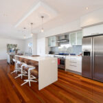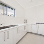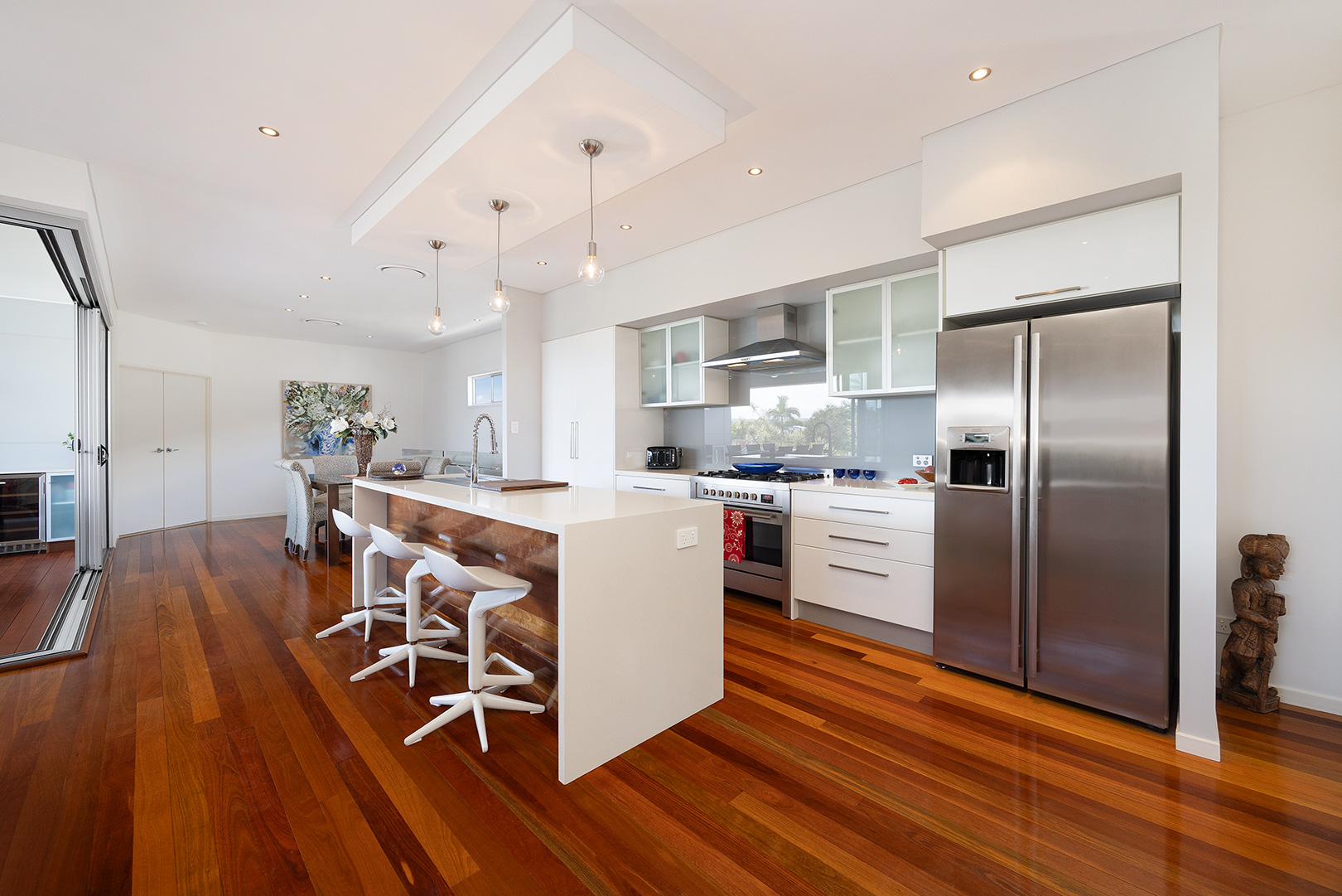 Stunning kitchen with 40mm waterfall stone bench tops, breakfast bar and elegant custom cabinetry.
