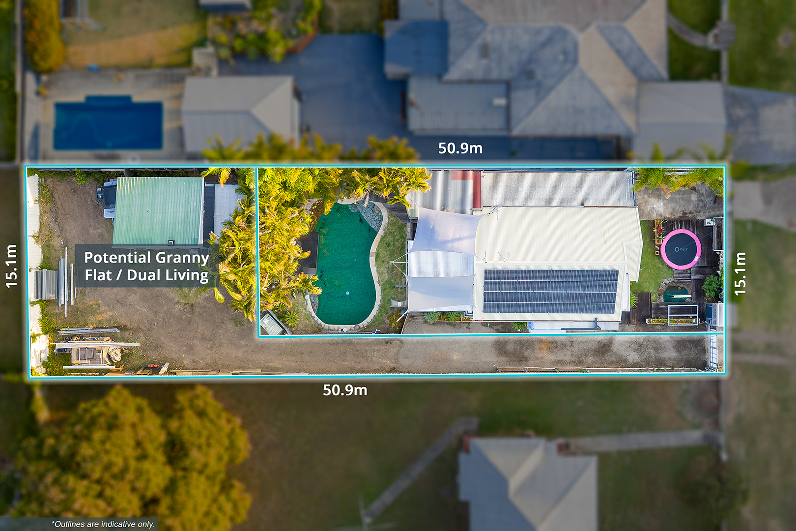 The property’s current configuration offers excellent potential to maximise dual living. With existing side access and a separate granny flat/office already on site (with shower and toilet – not currently approved), this block is primed to be reconfigured into a dual-residence opportunity. Whether it’s for extended family, teenagers, office, or an additional rental income stream, the scope to add value and versatility is significant.