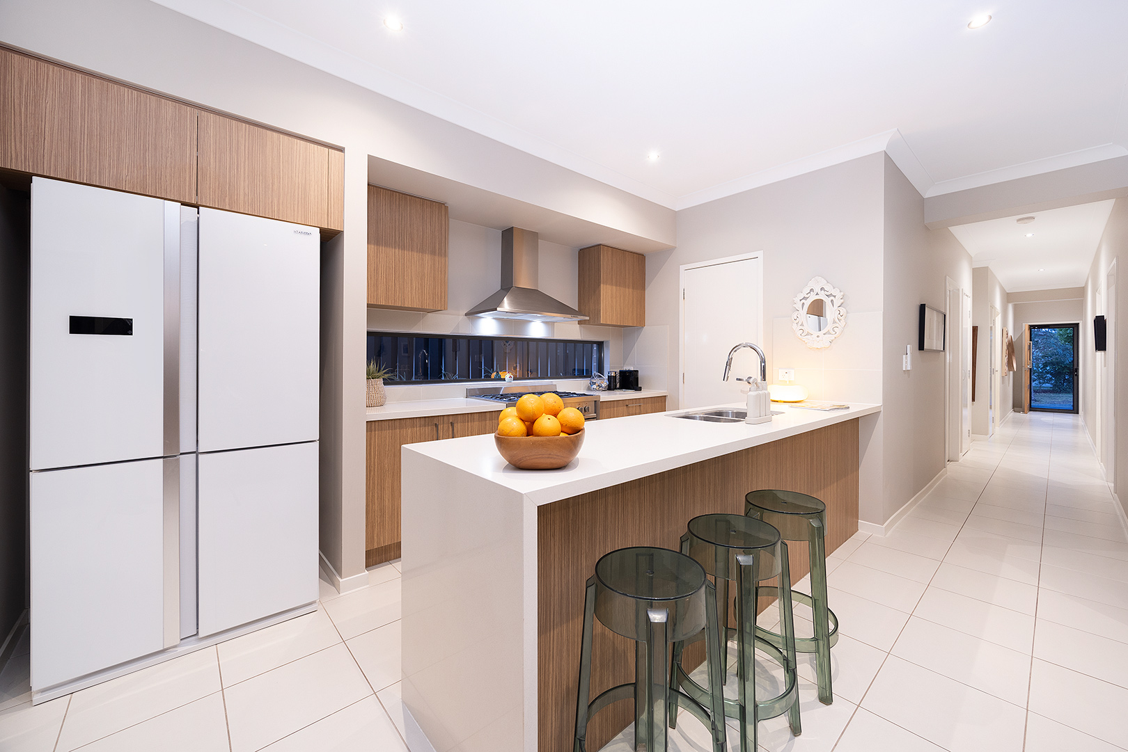 At the heart of the home lies the gourmet kitchen, featuring 40mm stone benchtops, stainless steel appliances, gas cooktop, and dishwasher. Set under 2.8m high ceilings, this space perfectly blends luxury and practicality, creating a warm and welcoming atmosphere.