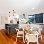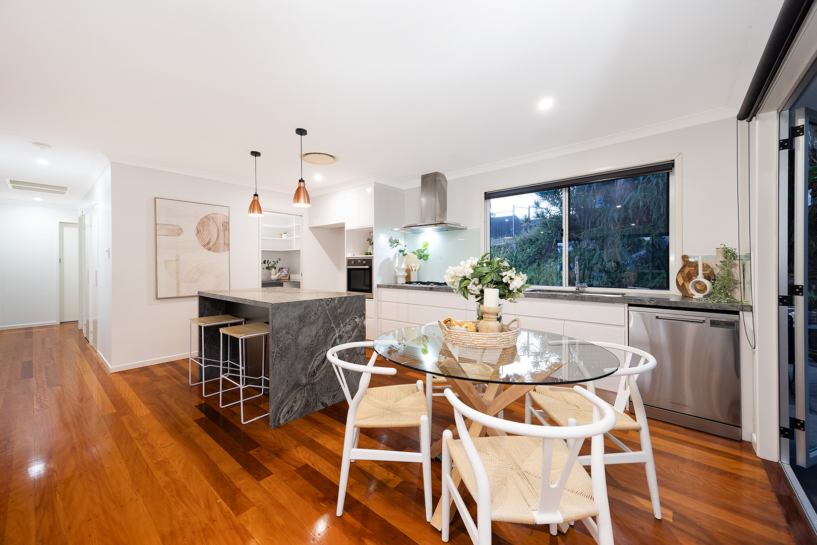 Inside, a spacious open-plan layout seamlessly integrates the living, dining, and kitchen areas, enhancing the sense of flow and connection throughout. The recently updated kitchen is a standout, combining modern finishes with functionality. Emerald green benchtops bring a stylish flair to the island bench, walk-in pantry, and cabinetry, while the kitchen opens onto both the deck and a rear patio leading to a private, grassed backyard.