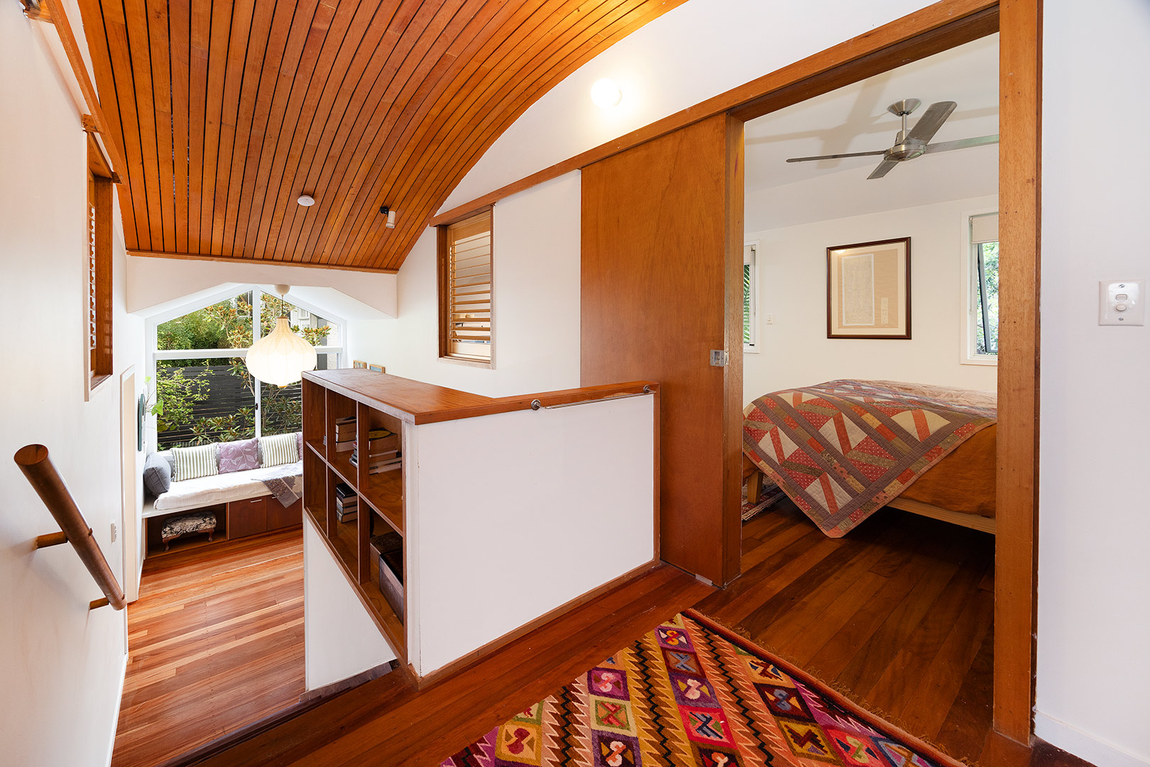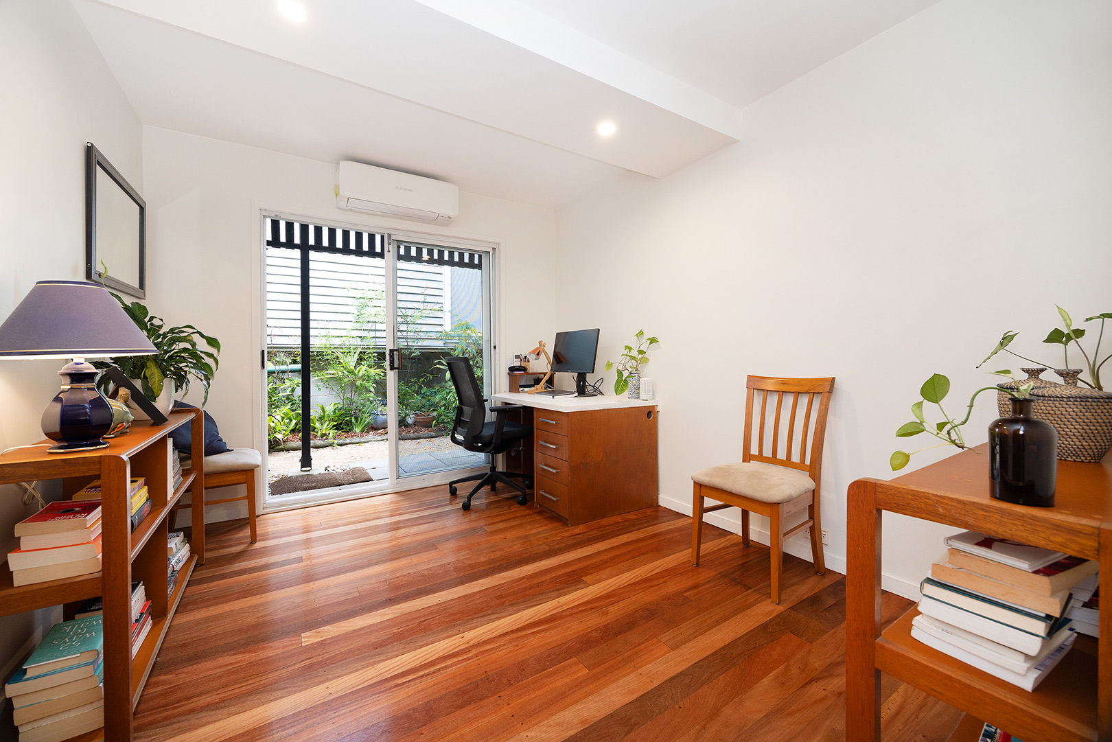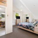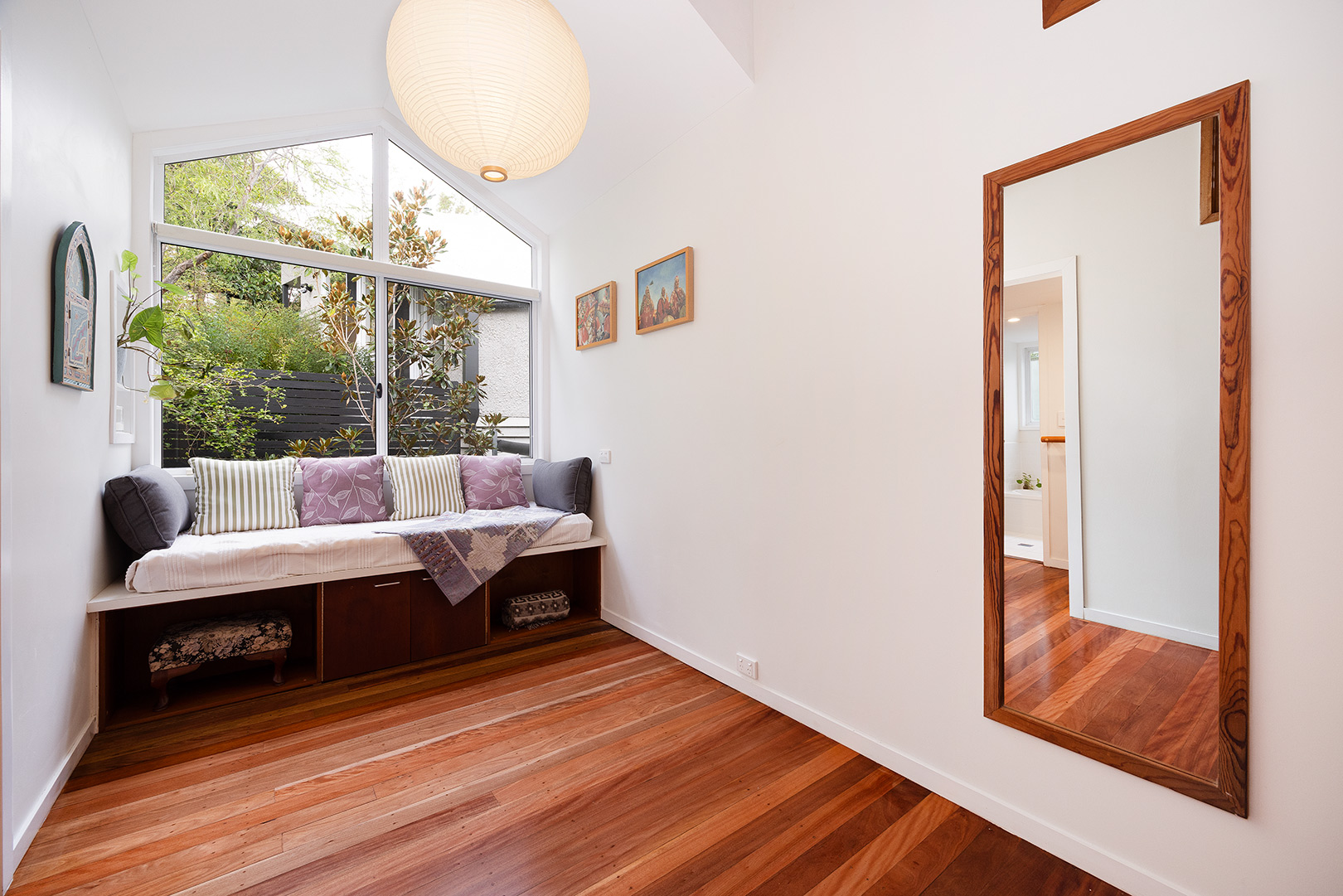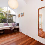 Ascending the timber staircase, you discover a sun-drenched reading nook that frames tranquil views of the central courtyard and established magnolia tree. This space could easily transition into a bespoke built-in study.