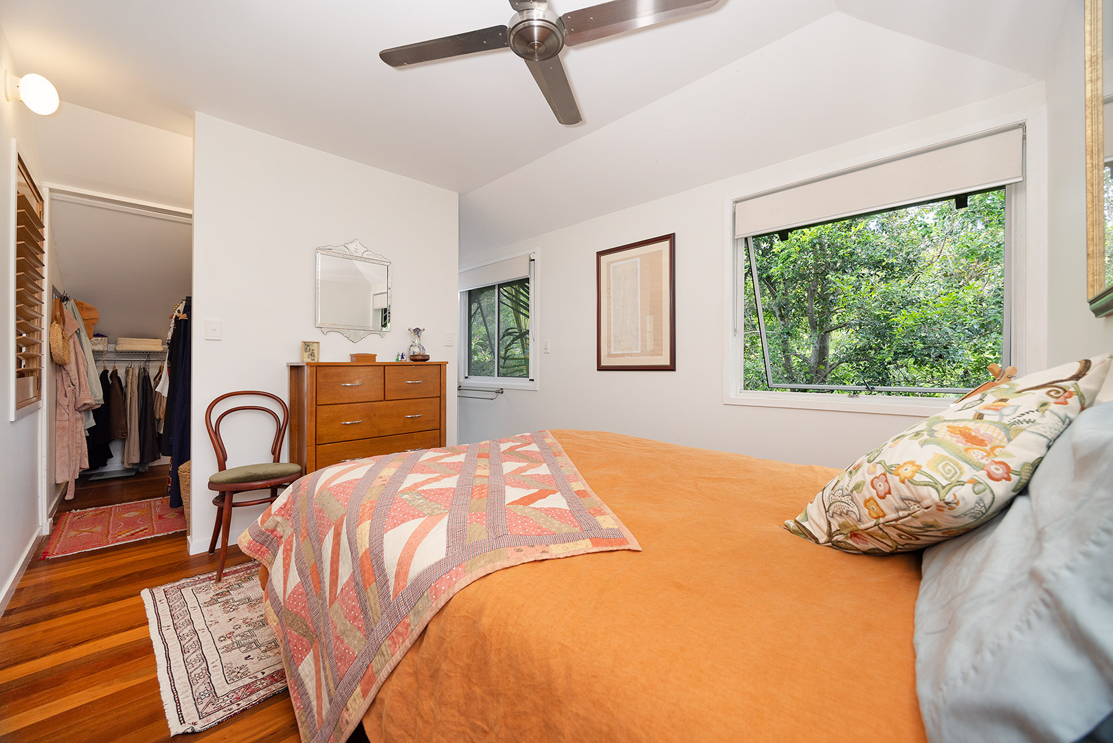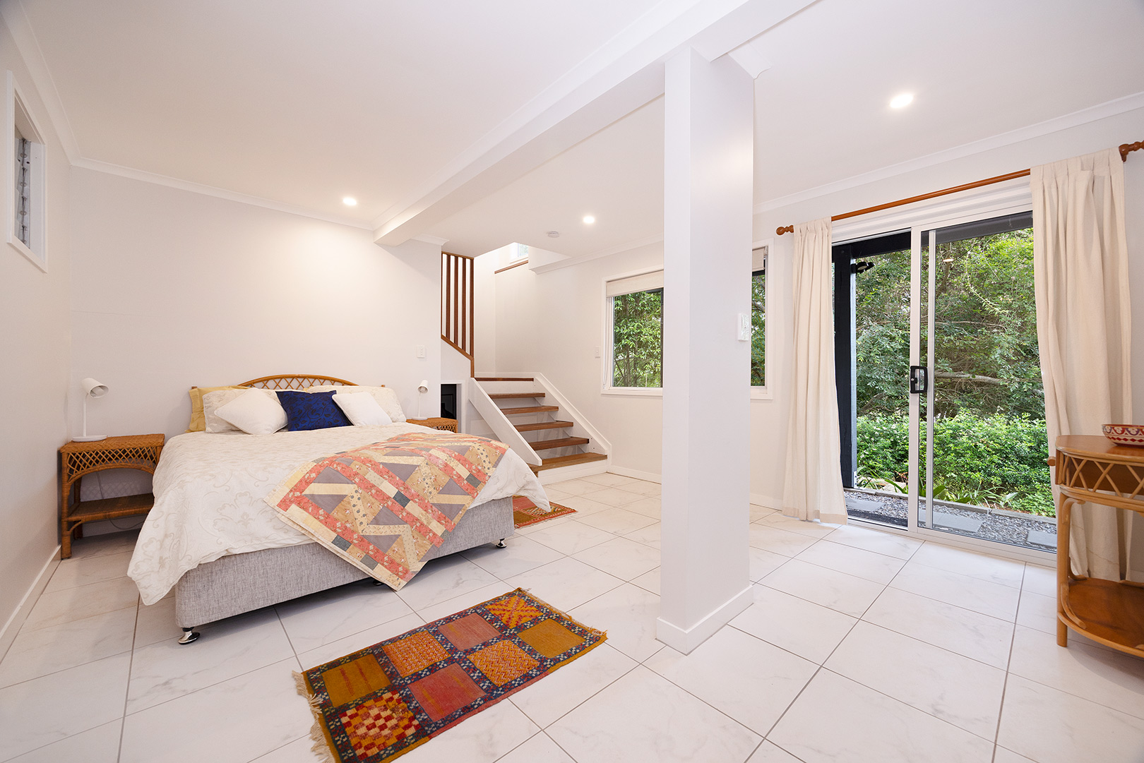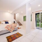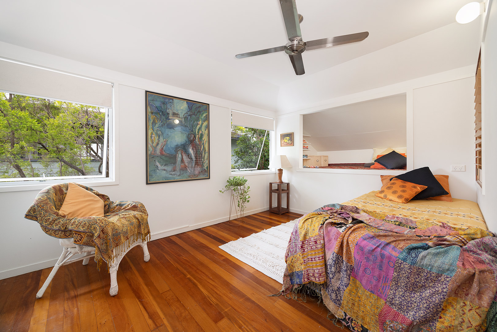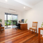 Ascending the timber staircase, you discover a sun-drenched reading nook that frames tranquil views of the central courtyard and established magnolia tree. This space could easily transition into a bespoke built-in study.